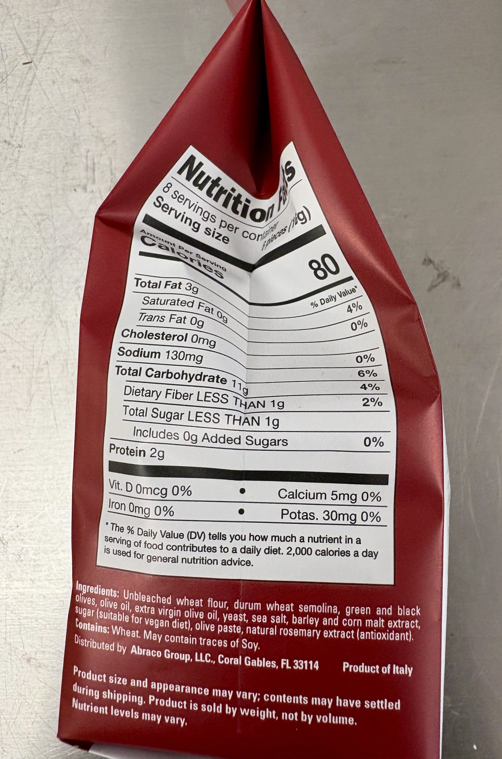 Unbleached Wheat Flour, Durum Wheat Semolina, Green and Black Olives, Olive Oil, Extra Virgin Olive Oil, Yeast, Sea Salt, Barley and Corn Malt Extract, Sugar, Olive Paste.