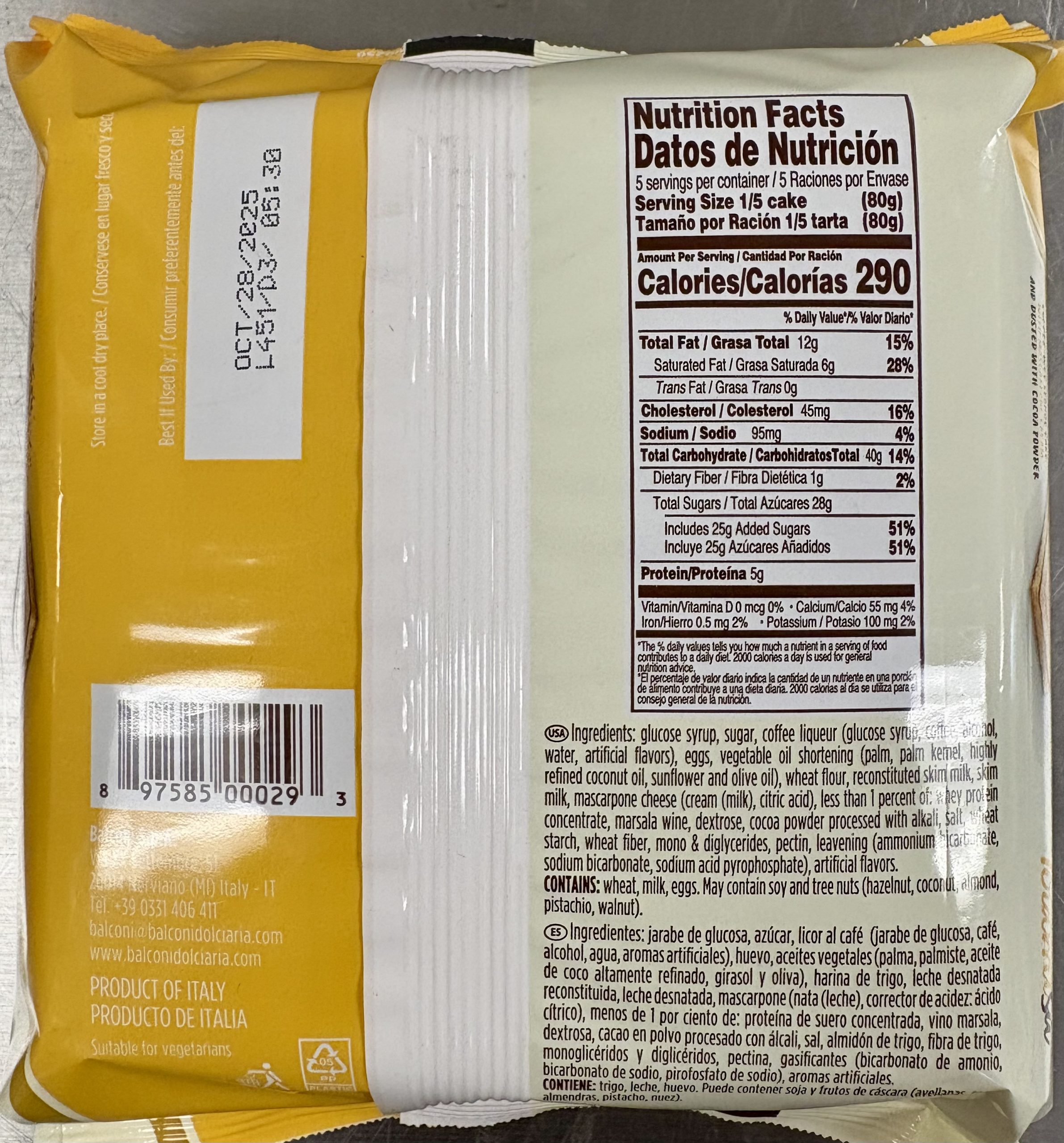 Glucose-fructose syrup, sugar, coffee liqueur (glucose-fructose syrup, reconstituted coffee powder (9% in the finished product), alcohol, flavourings), EGGS, WHEAT flour, vegetable fats (palm, palm kernel, coconut, in varying proportions), reconstituted skimmed MILK, skimmed MILK powder, MASCARPONE (1.8%) (cream (MILK), acidity regulator: citric acid), vegetable oils (sunflower, olive oil in varying proportions), MILK proteins, marsala wine, dextrose, cocoa (0.3%), salt, WHEAT starch, WHEAT fibre, emulsifiers: mono- and diglycerides of fatty acids, SOYA lecithins; stabilizer: pectin, raising agents: ammonium carbonates, sodium carbonates, diphosphates; flavourings. May contain traces of NUTS