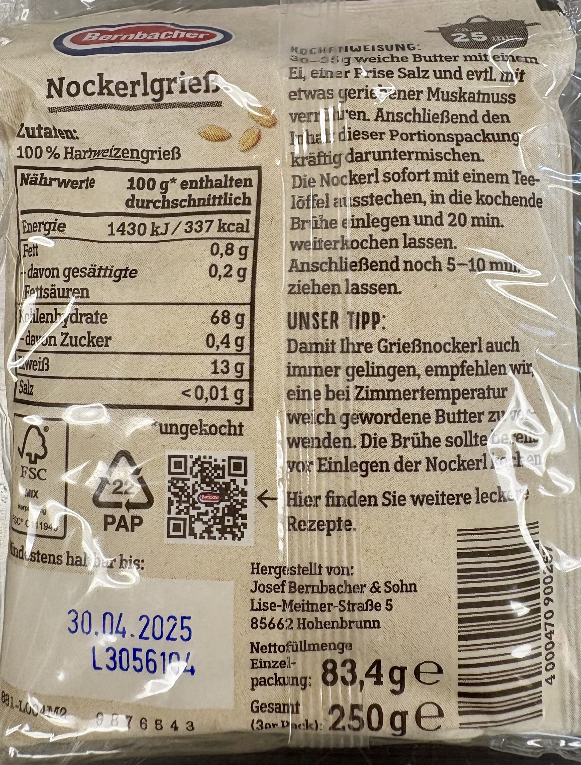 Bernbacher Nockerlgrieß is extra finely ground to make semolina dumplings particularly tender and fluffy. This Bavarian original is not only at home in the soup of the same name, but is also delicious as a dessert with berries and vanilla sauce. Give it a try!