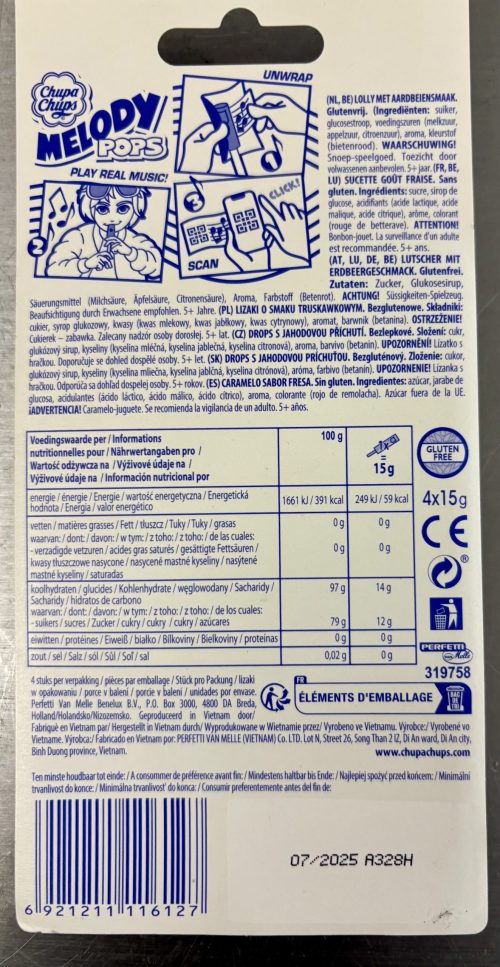 ingredients: sugar, glucose syrup, lactic acid, malic acid, citric acid, flavoring, and color (beet red for strawberry flavor).