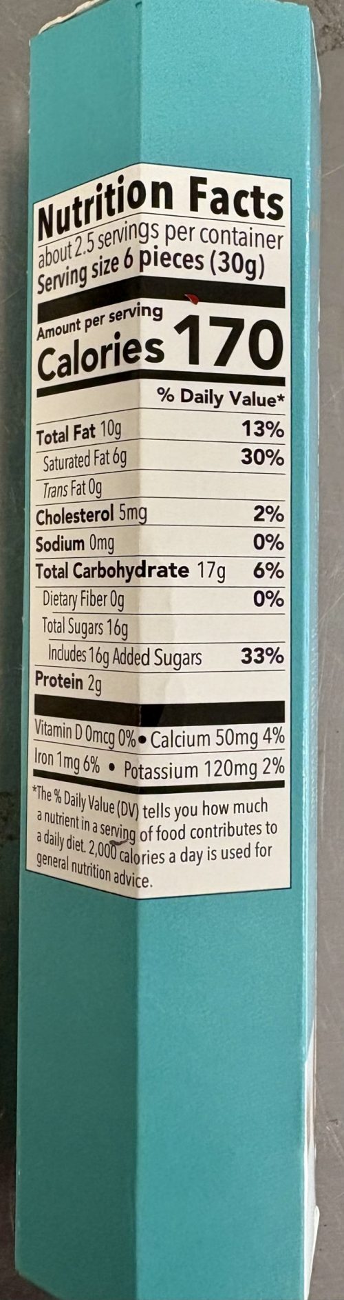 sugar, whole milk powder, cocoa butter, chocolate liquor processed with alkali, caramel pieces (sugar, cocoa butter, rice starch, sea salt), milk fat, soy lecithin, and vanilla flavor