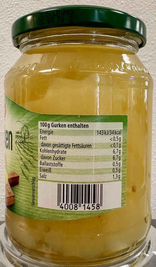 Ingredients. Peeled cucumbers, spirit vinegar, sugar, salt, mustard seeds, spices, herbal extracts, spice extracts, acidifier citric acid, antioxidant ascorbic acid