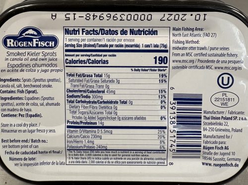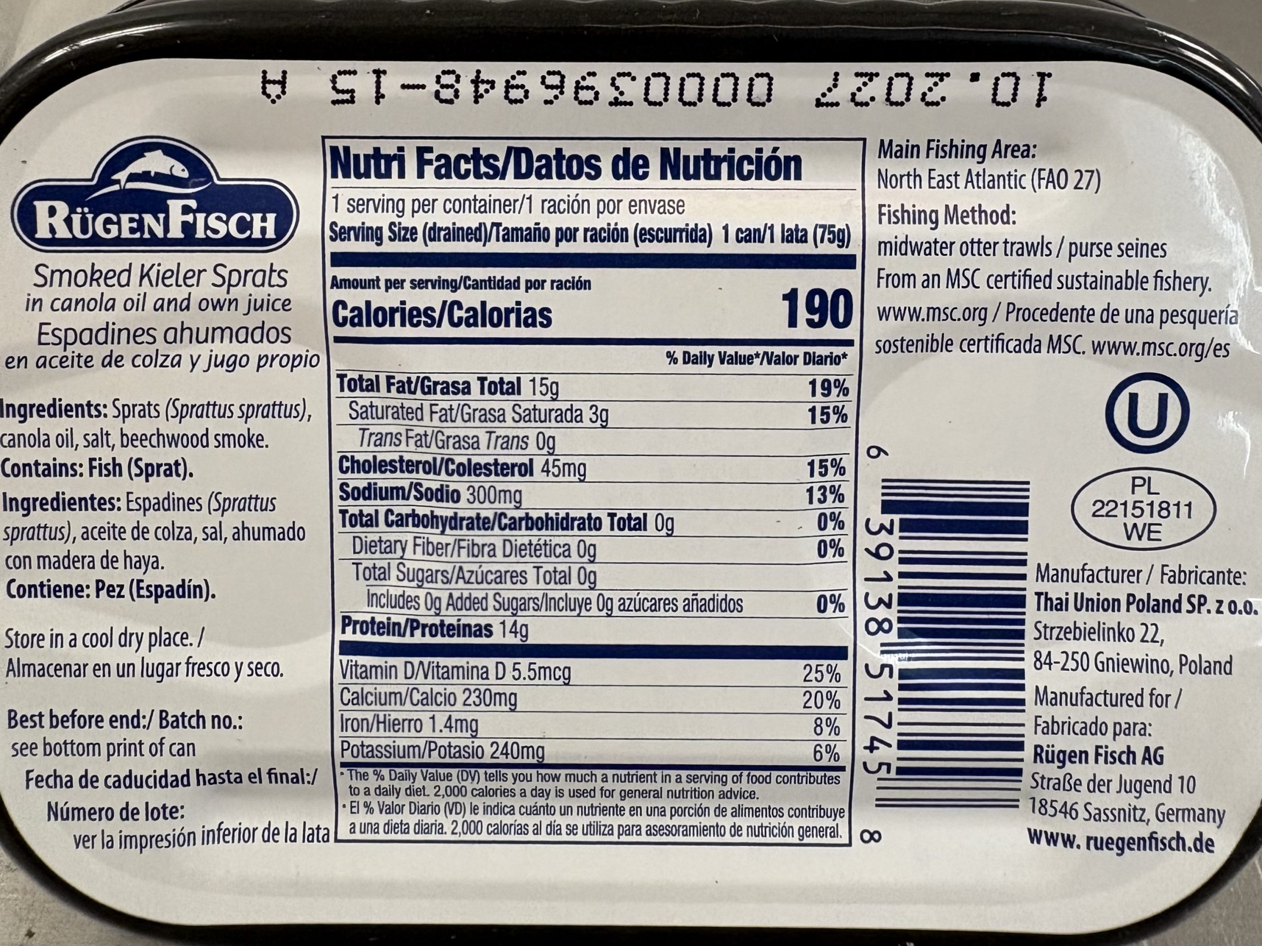 Sprats (Sprattus sprattus) (75%), rapeseed oil, table salt, beechwood smoke.