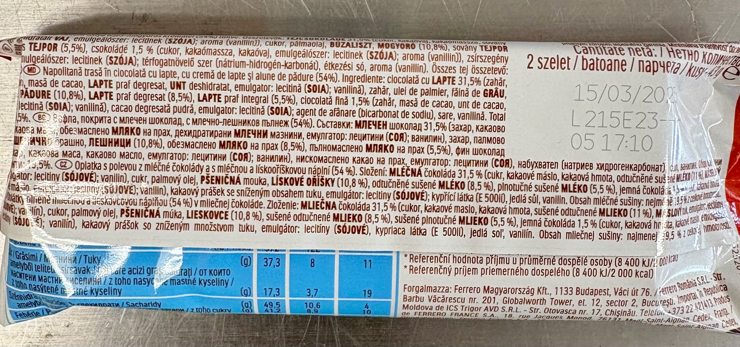MILK CHOCOLATE 31.5% (SUGAR, COCOA BUTTER, COCOA MASS, SKIMMED MILK POWDER, CONCENTRATED BUTTER, EMULSIFIER: LECITHINS (SOYA), VANILLIN), SUGAR, PALM OIL, WHEAT FLOUR, HAZELNUTS (10.5%), SKIMMED MILK POWDER, MILK POWDER, CHOCOLATE (SUGAR, COCOA MASS, COCOA BUTTER, EMULSIFIER: LECITHINS (SOYA), VANILLIN), FAT-REDUCED COCOA, EMULSIFIER: LECITHINS (SOYA), RAISING AGENTS (SODIUM BICARBONATE, AMMONIUM BICARBONATE), SALT, VANILLIN.
