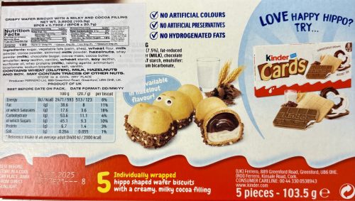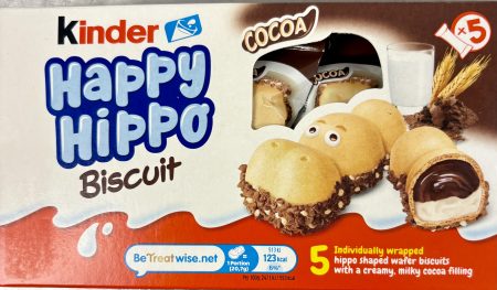 “Kinder Happy Hippo Cocoa Biscuit Bar features a crispy wafer in a charming 3D hippo shape, dipped in cocoa sprinkles on the bottom and filled with a creamy milk and cocoa center that kids love. Individually wrapped with fun Hippo characters, it’s tasty, convenient, and delightfully fun to enjoy.”