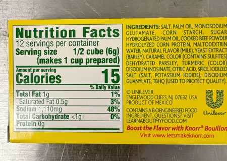 Salt, Palm Oil Monosodium Glutamate, Corn Starch, Sugar, Hydrogenated Palm Oil, Cooked Beef Powder, Hydrolyzed Corn Protein, Maltodextrin, Water, Natural Flavor (Milk), Yeast Extract (Barley), Caramel Color (Contains Sulfites), Dehydrated Parsley, Turmeric (Color), Disodium Inosinate, Citric Acid, Spice, Iodized Salt
