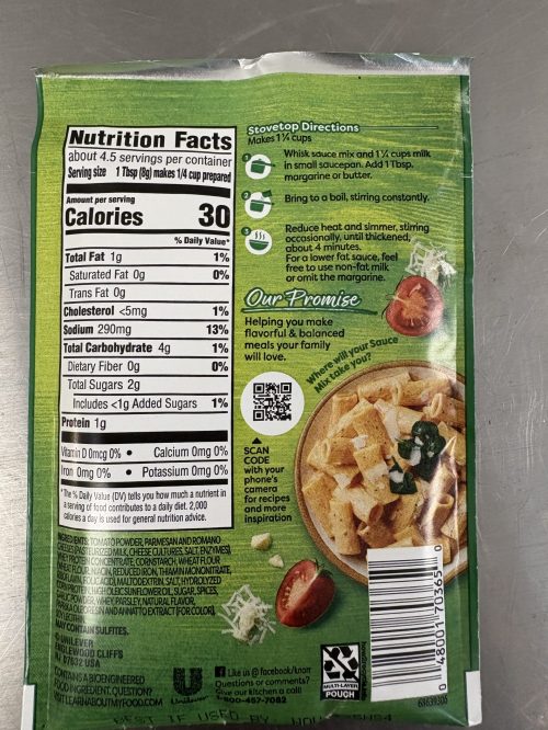 is a flavorful, creamy blend ideal for pasta, meat, or fish. Made with tomatoes, Parmesan and Romano cheeses, garlic, herbs, and spices, it brings rich taste to weeknight dinners and simple meals. Each packet yields 1 1/4 cups of homestyle sauce.”