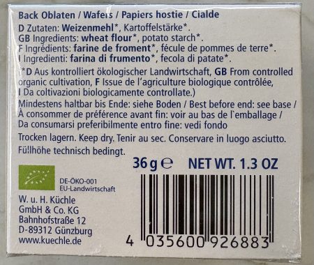 Ingredients: WHEAT FLOUR*, potato starch*, emulsifier: sunflower lecithin*. *from certified organic farming