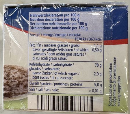 Calorific value: 363.00 kilocalories (kcal) Calorific value: 1,538.00 kilojoules (kJ) Carbohydrates: 78.00 Fat: 1.10 Carbohydrates, including sugar: 2.00 Dietary fiber: 2.30 Fat, including saturated fatty acids: 0.50 Protein: 9.00 Salt: 0.01