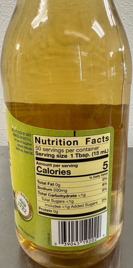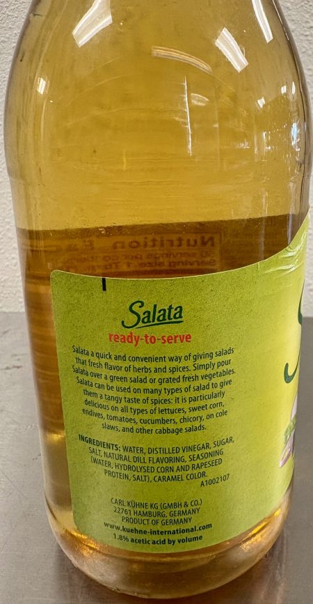 Water, brandy vinegar, white wine vinegar, glucose-fructose syrup, salt, spices, sugar, acidity regulator sodium acetate, thickener carrageenan, xanthan gum; herbs, natural flavoring, sweetener saccharin.