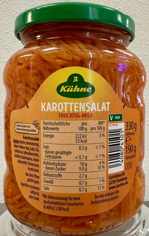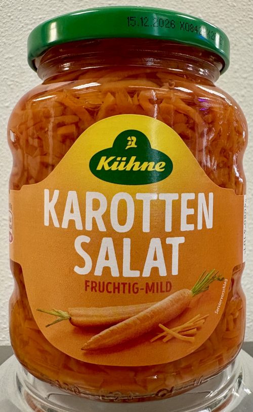 Ingredients: carrots, glucose-fructose syrup, spirit vinegar, sugar, apple cider vinegar, apple juice from concentrate, salt, lemon juice concentrate, natural carrot flavor, and antioxidants (citric acid and ascorbic acid