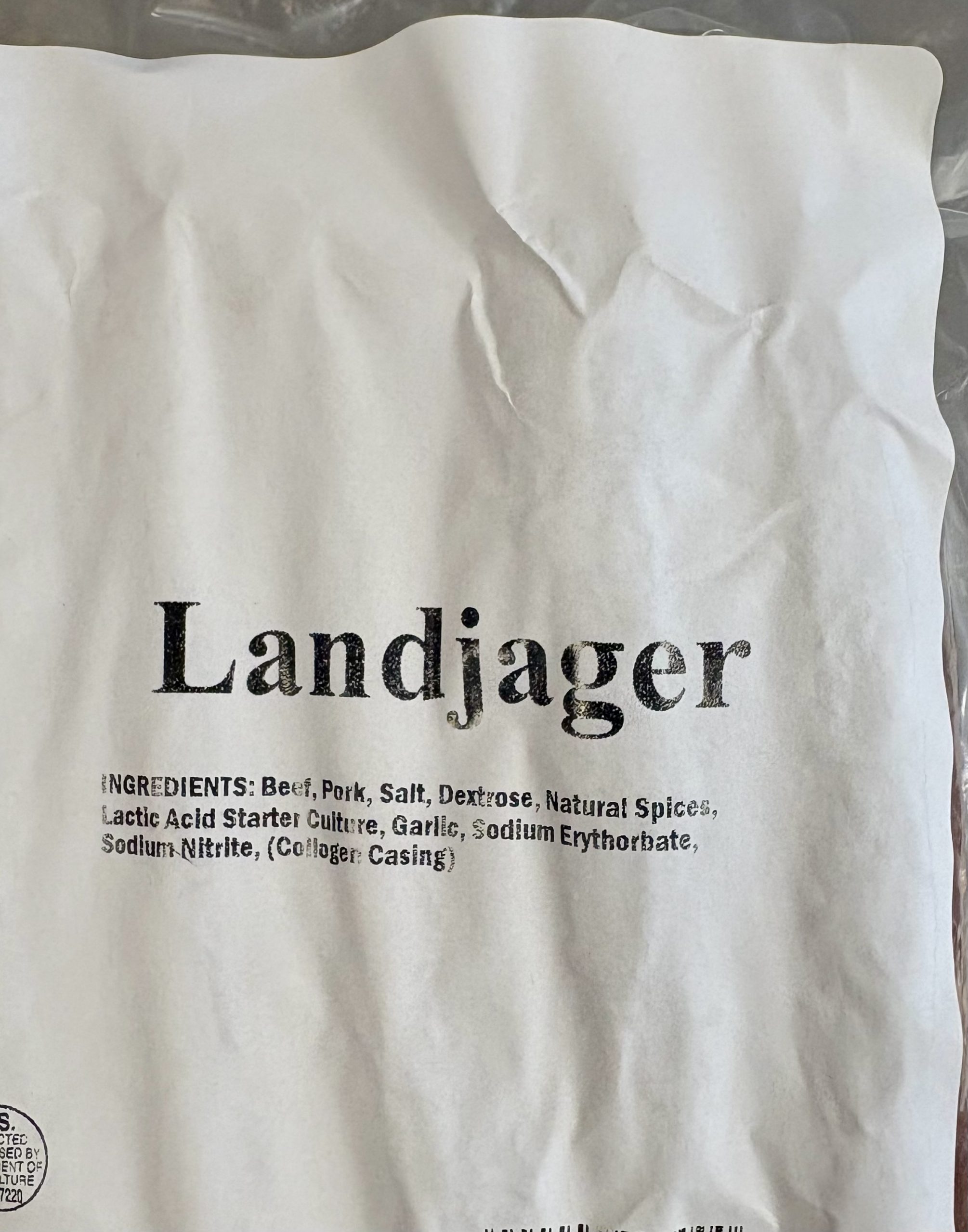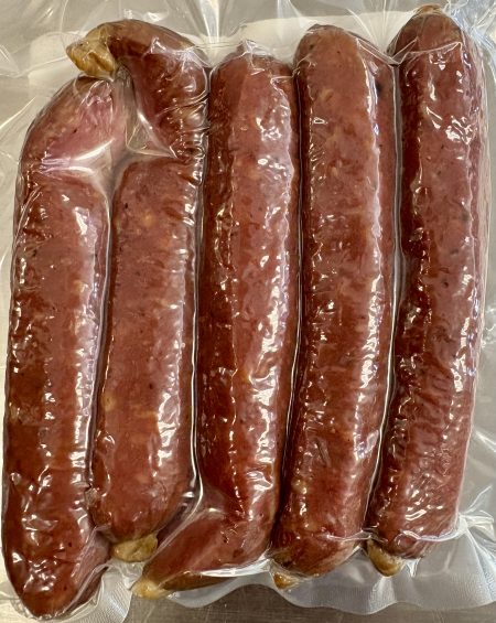 INGREDIENTS: Beef, Pork, Salt, Dextrose, Natural Spicel, Lactic Acid Starter Cuiture, Garlie, Sodium Erythorbate, Sodium Nitrite, (Collager Casing)