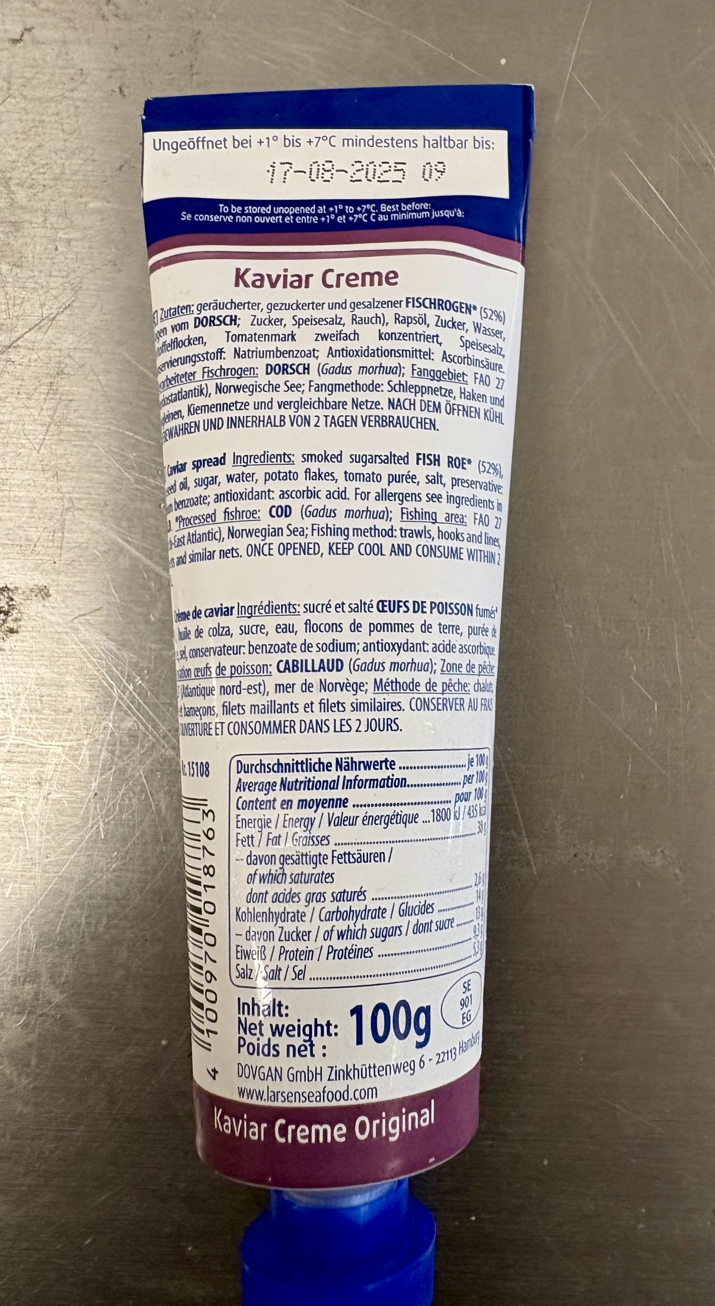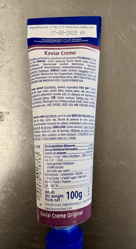 Smoked DORSCH ROE (50%), rapeseed oil, sugar, water, salt, potato flakes, tomato puree, preservative: sodium benzoate, antioxidants: ascorbic acid, citric acid