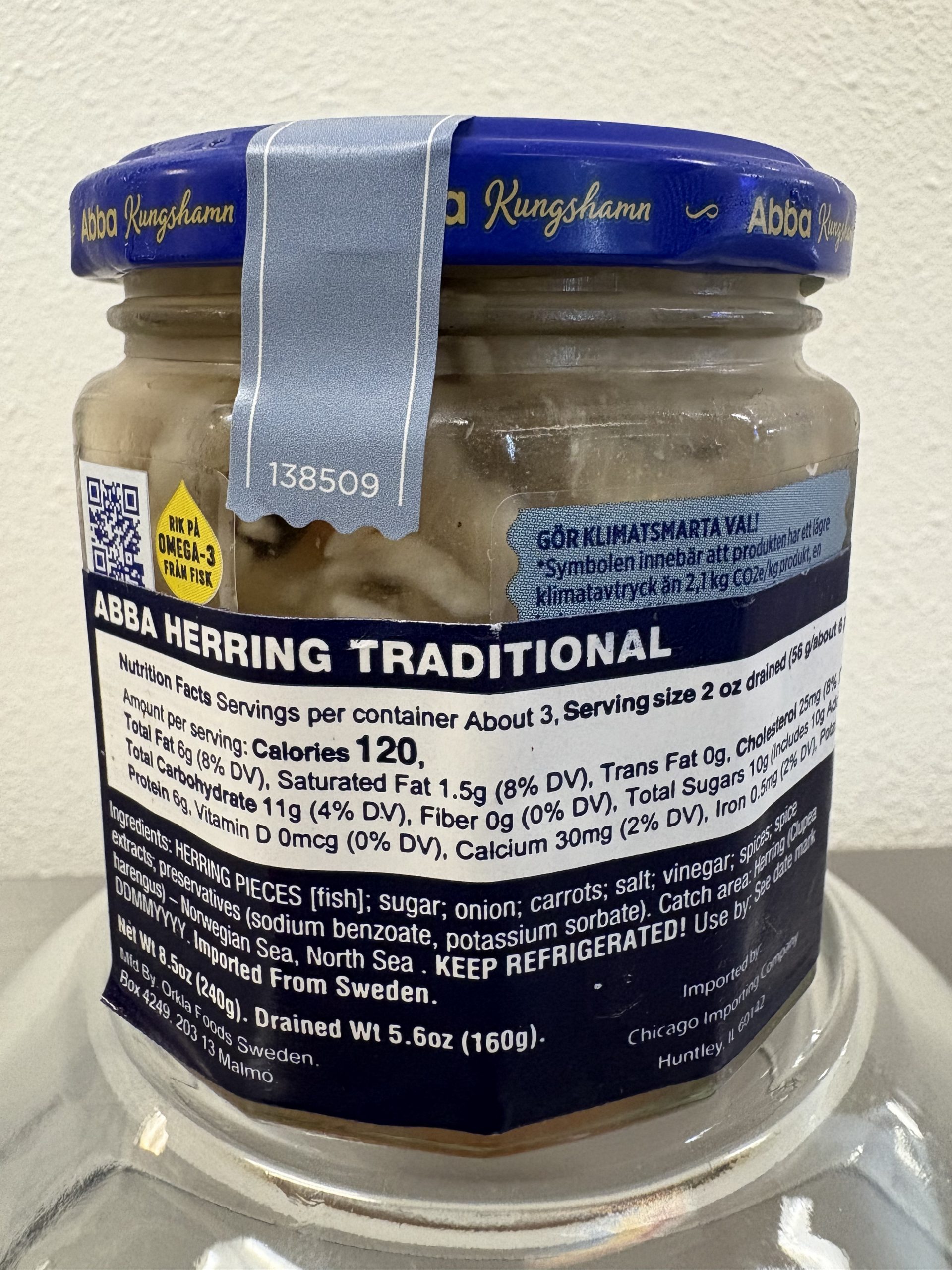 herring, water, sugar, onions, table salt, brandy vinegar, spices, and preservative (sodium benzoate)