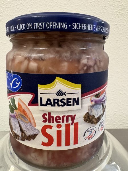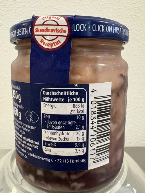 herring (50%), water, sugar, onions, dill, and spices, with a preservative (sodium benzoate), and acidifiers (acetic acid, and potentially others