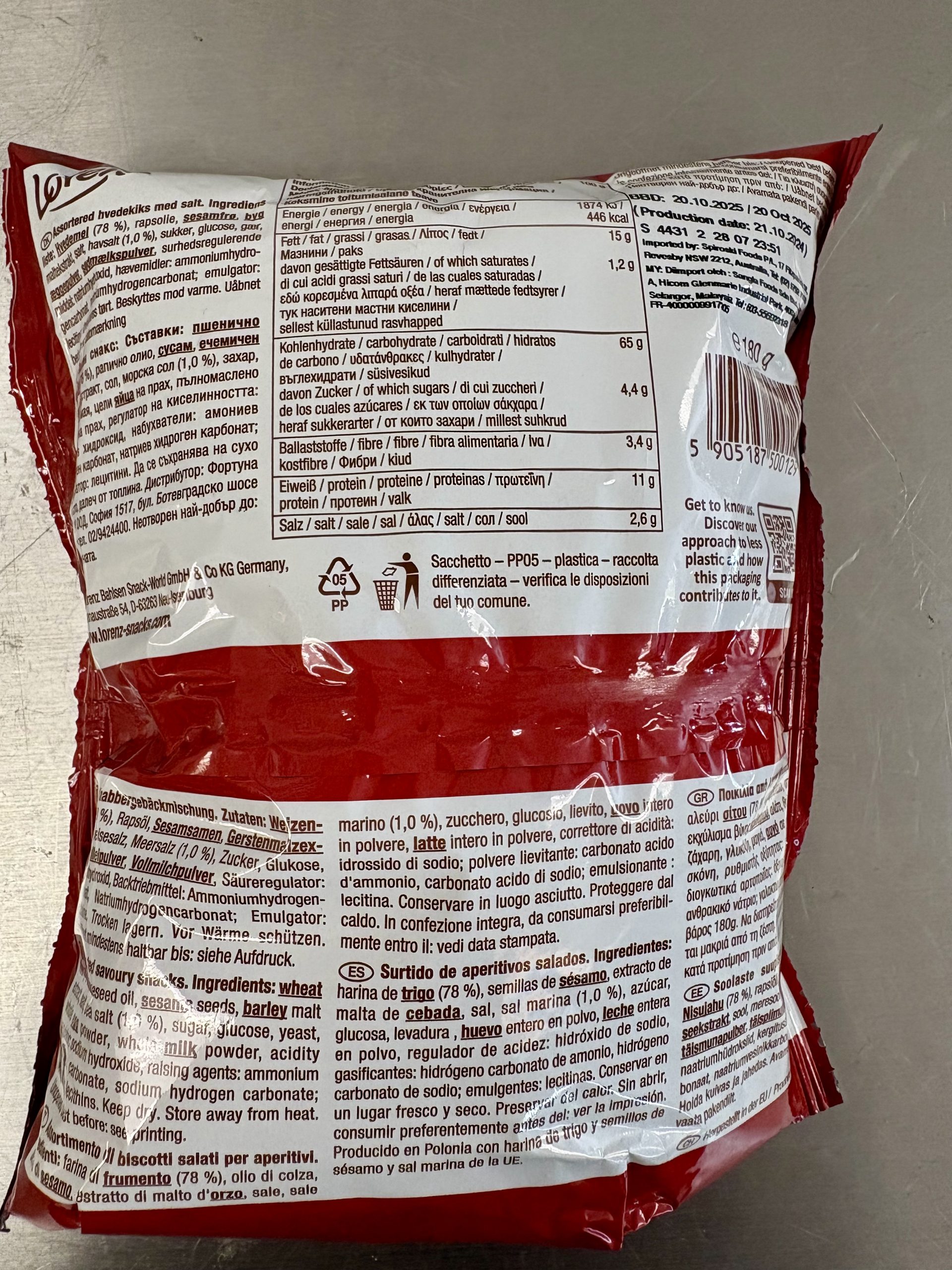 Wheat flour (78 %), rapeseed oil, sesame seeds, barley malt extract, salt, sea salt (1,0 %), sugar, glucose, yeast, whole egg powder, whole milk powder, acidity regulator: sodium hydroxide, raising agents: ammonium hydrogen carbonate, sodium hydrogen carbonate; emulsifier: lecithins.