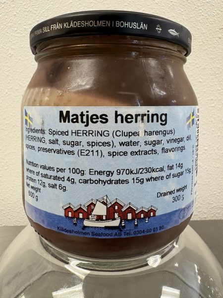 Spiced HERRING fillets (Clupea Harengus), water, sugar, salt, vinegar, dill and spices. Preservative E211.