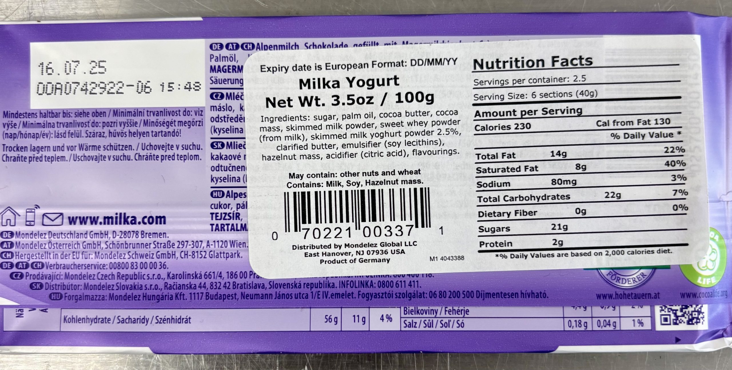 Ingredients. Sugar, Palm Oil, Whey, Cocoa Butter, Nonfat Milk, Chocolate, Lowfat Yogurt Powder, Milkfat, Soy Lecithin, Hazelnut Paste,